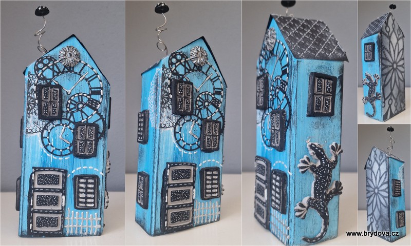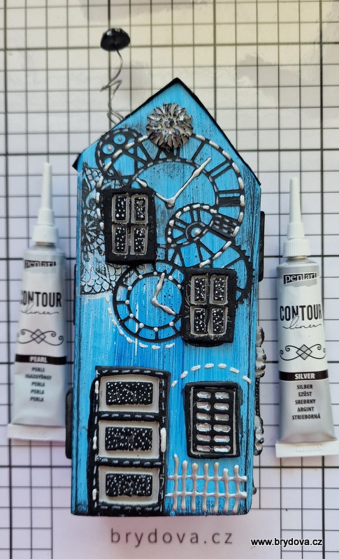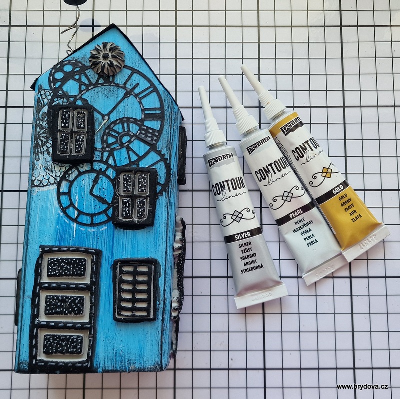 A stříbrnou konturu jsem vyzkoušela na dřevěný domeček.