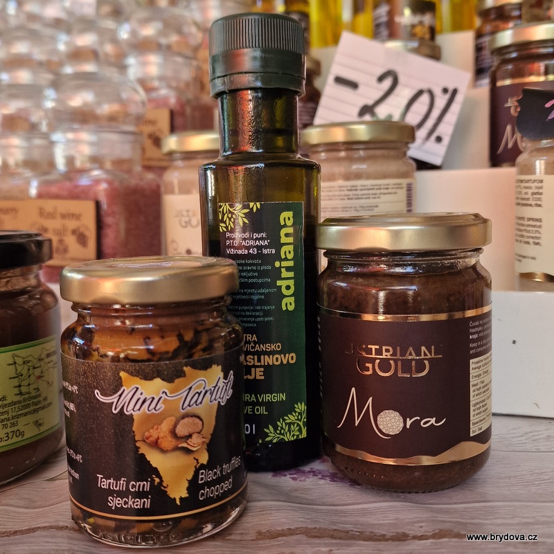 U jedné milé paní ve stánku v nudistickém kempu kupuji dárky – olivový olej, lanýžovou pastu a lanýže.