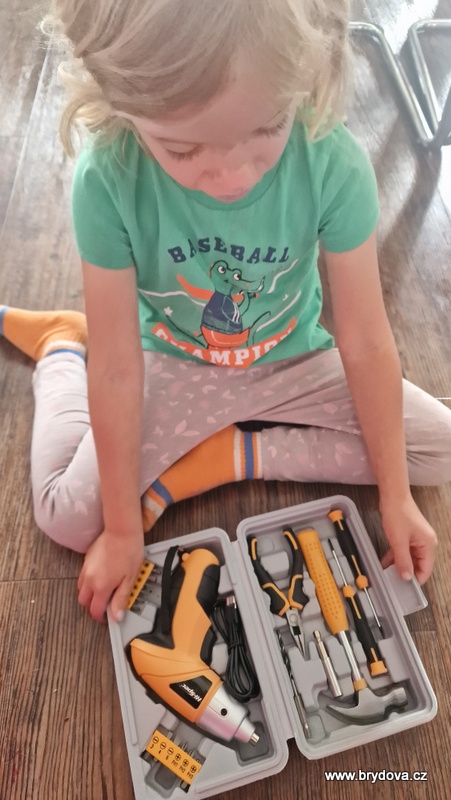 A sehnala jsem. Trošku byl problém sehnat jiné než růžové, ale podařilo se… opravdová aku vrtačka/šroubovák.
