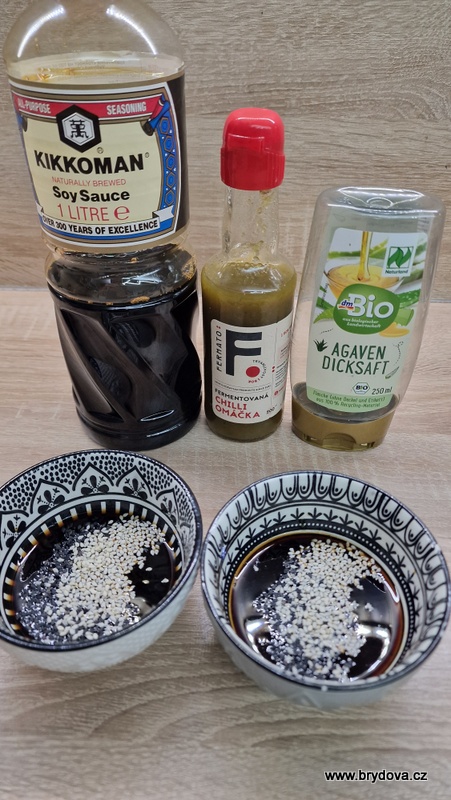A ty se namáčí v směsi sojovky, chilli omáčky, agáve sirupu a trošky vody.