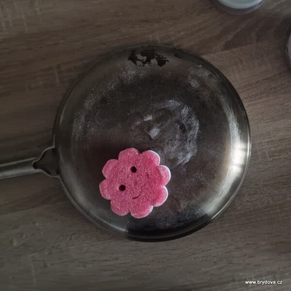 Začala jsem připálenou pánvičkou. Upřímně – nešlo to jako samo – pěkně jsem musela přitlačit houbičkou… ale připáleniny jsou pryč… mmch. proč se myjí pánvičky zespodu???